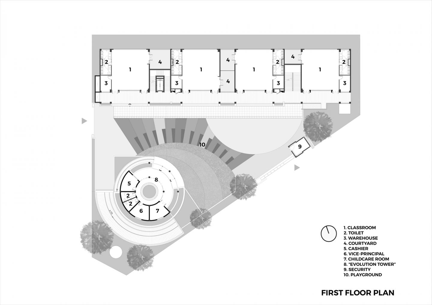 Faced with the requirement of increasing and synchronously organizing the space for playing - physical activities for children, the architectural concept has organized the structure of "Movement Tower" with a spiral circular structure, narrower at the top with the roof cover on the top and natural greenery in the core space. In terms of architectural aesthetics, the "Movement Tower" block helps the overall school architecture be dynamic and attractive. It is also connected fluently to the main classroom block by the long steel bridge structure.