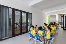 This solution also maximizes to easily change the interior, any times, depending on using different purpose, especially the arrange the furniture flexible and suitable with different types of lessons and indoor activities. This solution also makes it easy to rearrange the furniture into four corners of the wall quickly and conveniently, saving the classroom center space for a lunch break or social networking activities at different times of the day. Classroom space design also placed a 2 sides open space balcony between every 02 classrooms. The wide-glass windows facing the balcony support to receive the best natural light – ventilation (reduce the artificial energy) and ensure good eyesight for children. The open space balcony also supports coordinating and enhancing the children's communication ability between classes.