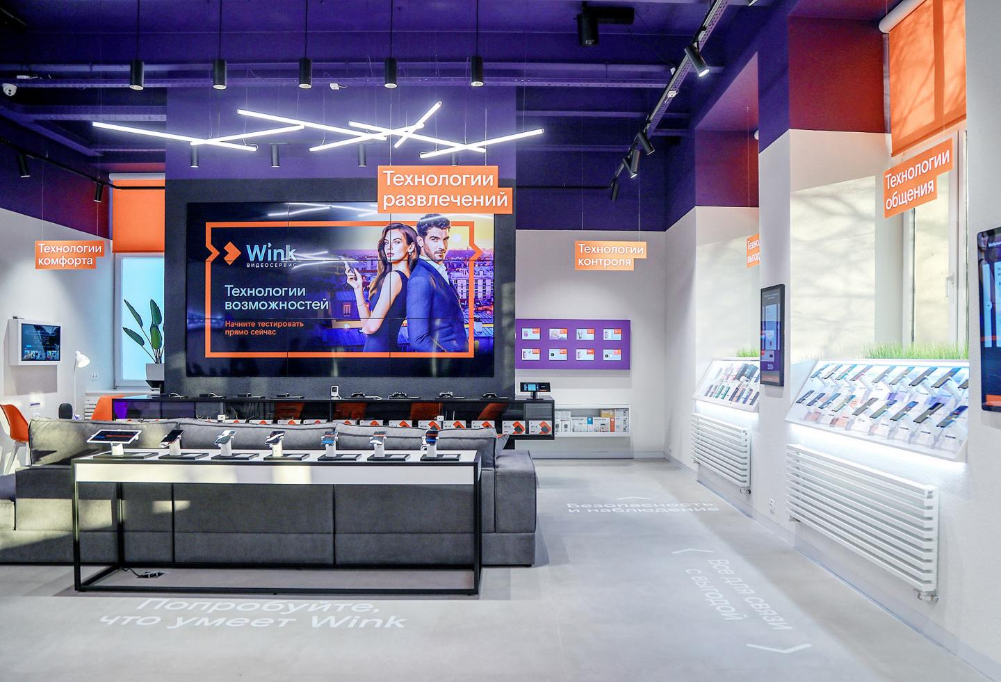 Rostelecom is the largest integrated provider of digital services and solutions in Russia. The company has a presence in all market segments and serves millions of households, public and private organizations. Rostelecom's new showroom is a multifunctional customer service center with many different interactive WOW zones (Smart Home and Video Surveillance, Cybersports, TV Zones), meaning that people can get a feel for Rostelecom's services right there. The bright navigation suspended in the air and animated hints on the floor help you to navigate the space. In the central area, you can find digital television and interactive entertainment services. The space has its own area for watching movies and testing set-top boxes from a generously proportioned and supremely soft sofa. There's a whole separate room for demos of the gaming service demos, and a mysteriously glowing portal that tempts you to peer inside. Smart home technologies are demonstrated in two stages. An interactive presentation which uses a virtual apartment to show us how smart devices can make life easier. What each sensor does and how it works is explained in a clear and visual way.