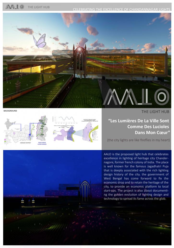 This architectural thesis portrays the remarkable excellence in lighting design of the city, celebrates the joy of enlightment through various festivals, majorly Jagadhatri Puja for which the city is internationally known after being the second French colony in India. As a government proposal of the state West Bengal, proposed by the chief minister Mamata Banerjee at the district head quarter meeting at Hooghly in 2016, AALO documents the gradual transformation in lighting technology along with commercializing the innovative lighting design