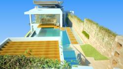 The house is on three levels. A ‘floating’ glass walkway leads to the entrance which opens into the upper level of a double height glass atrium drawing the eye through 180° of stunning views. This level includes a kitchen, dining room and main living room. A swimming pool and two terrace areas are also located at this level with a separate guest house situated at the far end of the plot. Stairs lead down to a lower level which houses three bedrooms, two bathrooms, a master suite, TV room and family room. In addition a study with ensuite facilities offers versatility. A plant room is on the basement level which also includes the water holding tanks.