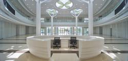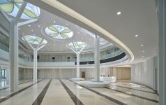The design of the building’s interior surfaces draws inspiration from the idea of "green", "island" and "intelligence" that further developed into formal elements of "leaf", "wave" and "code". The texture is expressed in the language of points, lines and surfaces, which materialize, extend and stretch out in the building interior. Natural daylight from the lobby’s skylight is refined as it passes through the elements of "leaves" and columns that resemble trunks. With multiple design details emphasizing the space’s ecological and cultural character, a contrast is formed against the walls’ pattern in an abstract form of digital matrix that represents smart technology.