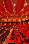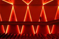 The entire auditorium has triangular red and gray fabric panels outlined with recessed lighting. The cantilevered balcony has a gray band taped along its railing, visually separating the two levels. The dominantly wooden stage area is highlighted by triangular sections, angling toward its center from all sides. The entire space is covered with wooden slats and acoustic fabric to increase sound absorption. The quilted seats aligned in crisp military-like rows and beneath them, is a neatly spread custom red and beige floor carpet. Support facilities like the green rooms, restrooms, and food court, all surround this auditorium hall, making it functionally sufficient.