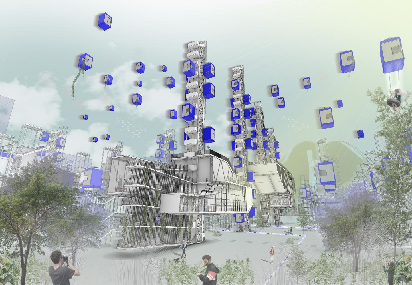 During the design of the residential island, a number of decisions were taken, such as rethinking the approach to housing, rethinking transportation, rethinking the use of energy resources, rethinking the concept of equality when people have a more egalitarian understanding. Built on a modular construction system, everyone has their own living spaces in this city. Capsules with these living areas also provide urban transportation. Thus, an understanding of a city that is far from the smell in the lower layer of the city and is in relationship with the sky comes to the fore. The town has a residential island, the mainland where production is made, an island of wind turbines and an island of solar panels.