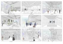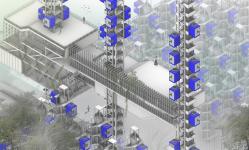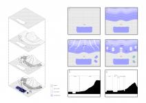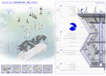 The research center, located in the other part of the project, is located on an axle extending from the main pier, which allows the transport of plants located on the residential island of the city. The center aims to study endemic plants obtained in agriculture, which is the source of production of the city, and to develop vertical agriculture in this direction. This center, which features variable users as a tutorial, also creates a meeting point for fixed users and creates an area where they can get professional support in the study of vertical agriculture and plants they work on in the daily training center. As a result of the program created, exhibition areas that allow the exhibition of research products; informing the public, conference room where they can have a say in the production of the city; there are workshops where the public can study and work on plants, and public terraces quite close to the sky where they can park their pods at stations and spend time together and observe. In addition, the research center has a laboratory that can be used by people in a variable group, such as scientists, researchers, farmers. The laboratory aimed to study endemic plants obtained in agriculture, turning a process in which they could experiment by working jointly on it into spatial. For this purpose, there are specially designed reel and tape systems in the laboratory. These systems aim to help the user act jointly, to cycle the process as soon as possible and to help the innovative aspects of the laboratory.