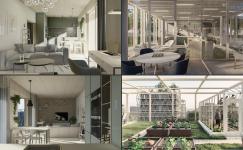 water from the order. Rainwater is accumulated in public water features or on green roofs and is used to cool and improve the microclimate throughout the area. The produced electricity is used directly in buildings or accumulated in the battery storage. Energy is shared through a smart grid network between objects with a family peak day. The result of the entire design are buildings with extremely low energy needs for heating and possible self-sufficiency. Designed objects have a heat demand for heating less than 15kwh/m2.a.