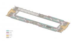 works like a diagrid system. The size of the columns depends on the volumes that they are needed for. These columns are used in case of crossing wide spans, creating pop-ups, and voids. With various combinations of these curved columns and regular columns, modules are created, which are the same in size but different in shape. These modules can be shaped according to the need of the space. With the gathering of the different modules, new structural shapes and voids can be formed. The system is based on a simple spatial modulation that