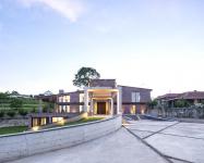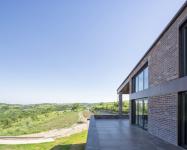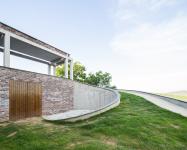 The house sits at the peak point of the land and three new concrete ramps are designed to be used to connect the spaces within the plot. The first ramp is located at the left that provides a linear car-way in between the entrance and the main front courtyard, while the two other ramps are located on the right and designed to provide a pedestrian and truck way to the farmland. The pedestrian ramp provides a direct passageway to the lower level and the truck ramp curves up to merge with the farmlands. Furthermore, a series of terrace gardens are designed with stone walls on the left side of the site.