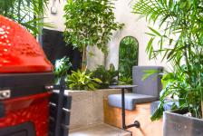 After the container has been successfully delivered into the space, the pre-existing concrete ramp has been demolished, and the sunken ground floor allowed the realization of a stepping entrance instead of it that creates a pleasant buffer area between outdoor and indoor, with a casual lounge bench, a sculptural pantry, and a delivery area integrating tropical plants and lemon trees that visually fill up the view of this double-height entry. This space is conceived to be flexible enough, thanks to some foldable custom-made tables, allowing large meetings, casual events, or gathering of the staff in the pantry area during lunch time.