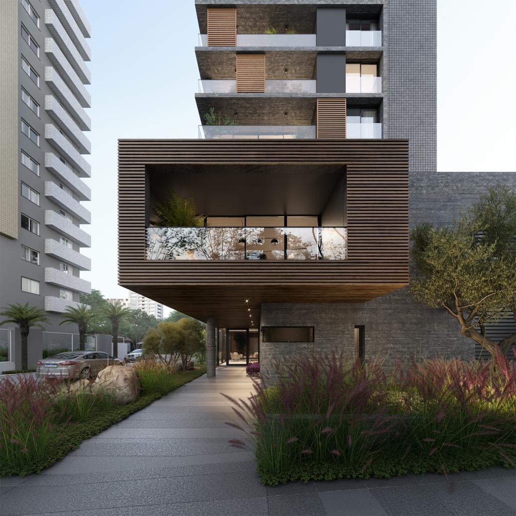 Volumetrically, the structure is constituted of an ample vertical monolith marked by your vertical and horizontal lines. The balconies with apparent concrete slabs and wood brises make the facade unique, bringing the ideia of movement to the building. The Acess is marked by a big wood volume that moves towards the street and welcomes the residents. The architecture is serene, where the materiality of exposed concrete and the wood brises shows its authenticity.