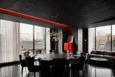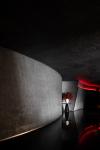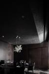 The entire restaurant is operated as a group of private rooms, which are distinguished by abstract patterns of Chinese 24 Solar Terms made of luminous acrylic and by hues. The black gall wood with soft texture and the black, natural and rough art paint from Italy enrich the black tone with varying aesthetics. Black mirrored stone materials and light gray wood applied to the floor reveal a sense of future and warmth.