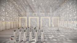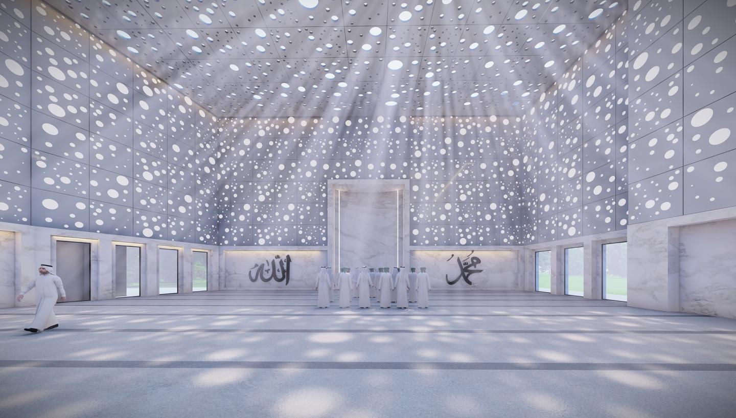 In classical Islamic architecture, there is a situation of receiving daylight from the windows between geometric spaces. The architectural elements in these window spaces are called masrebiyye. The light is taken by shreding it into the mosque with masrebiyyas. One of the most fundamental features of Islamic mosque architecture is that the light is broken up geometrically and taken into the mosque as light rays of different sizes. In this mosque, as a new interpretation of this, the light is taken into the space with round spaces of different sizes. The ceiling and walls of the mosque act like a masrebiyye. In this way, the masrebiyya culture in classical Islamic architecture has been reinterpreted and reused with a modern expression. The marble level rises up to the human level and adds the human scale to the 15 m main mosque space. After this marble area rising up to human height, aluminum panels and led lights coming from the round spaces formed in these panels were designed. Every moment of prayer is a moment to question life again and to take account of oneself by questioning oneself before Allah. These advancements that prayer will bring about in the human soul and life are symbolized by these round lights.