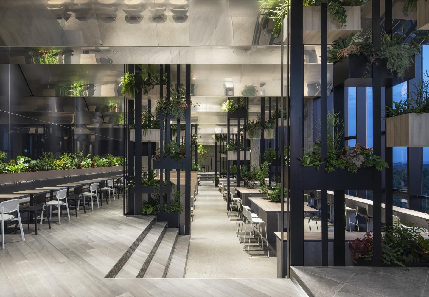 In practice, the entire space is designed to resemble the sea surface. This has been achieved by creating waves on the ceiling surface that come form the gradation to vibration of stainless steel processed onto the mirror face. In addition, by using the materials that reflect on the walls the movement of people, clouds and the sun, we have arranged a space where you can feel the fluctuations of the whole interior. On top of that, by making indoor plants look like seaweed we have expressed the underwater life.