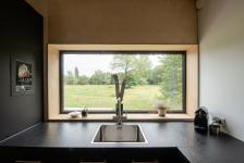 The overall interior is completed with wood, to enriche the rural aesthetic. The open staircase has also made of birch wood, matching the structure. Other parts of the interior, such as the interior door, kitchen and stair railing, are finished in matte black, just like the exterior window frames. In this way the inside and outside of the house are deeply related to one another.
