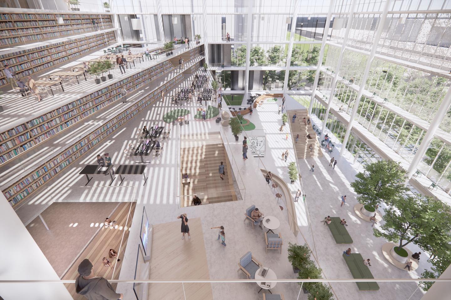 Apart from that, each floor is visually connected to an outdoor green area and lit up with abundant sunlight. The library stacks are fully visible from the hub and become a threshold to separate necessary quiet zones and service areas.