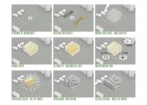 The floor plans start with a simple 18m wide module for daylight maximization. This module is repeated to achieve the required area; the modules are then angled to avoid deep floors, and also create vertical connections through voids. The staggered modules are stepped, similar to a staggered pile of books, creating a continuous upward circulation.