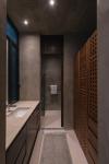 The walls and ceilings are covered with grey burnished cement, leaving the ground floor with white burnished and polished cement, while a bamboo floor covering was used upstairs. The vertical circulation cube separates the public area from the private and gives access to the mezzanine level and to the roof terrace where an area for rest and observation of the city is created in the shade of a tree.