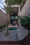 The suture point between both buildings is an open space that allows observing and dimensioning the contemporary element completely finished in burnished grey cement and foldable glass walls. This transitional space houses a small pool and an open courtyard surrounded by a garden consisting mainly of stone elements both as walls and floors.