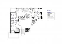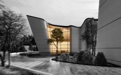 According to client requests, the design involves a suite for guest on the ground floor, 4 master bedrooms on the first floor, 2 pools (outside and inside the house) and a roof garden.