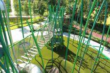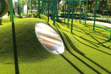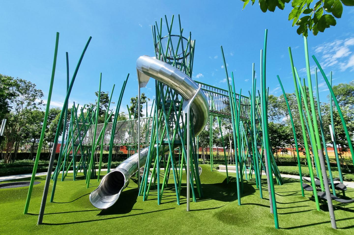 Mimicking the natural growth of bamboo, three twisted steel towers rise up from the ground. A thrilling enclosed tube slide with a skylight at the end for children to peer out of curls around the tallest tower, enticing the young ones to whoosh safely down to the ground. The other two towers consist of watch-towers with different play elements, encouraging children to scale its netted nucleus for a bird’s eye view of the lush surroundings.