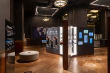 The new circulation now allows access to the original vaults and its historical Safe Deposit Box space beneath the main hall. The restoration and transformation of this space was of the utmost importance since it became one of the main attractions of the new museum. The vault was transformed into an immersive 360º video experience projected on its newly cleansed and restored walls, lined with an acoustic treatment to control the natural reverberation on the space. The design team restored the steel, brass, and copper panels inside the vault to adapt it to its new function as a didactic space. Moldings placed after the restoration concealed CCTV services, HVAC control, smoke detection, and Wi-Fi. New bank teller windows were installed in the safe deposit box room replicating the original ones which were refurbished and restored. Soft general lighting was added to take in the space.