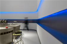 The prevailing dark blue light throws the space into a seemingly universe background full of endless energy flow.