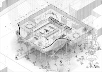 "Topographic voids" proposes a new model of verticalization of a traditional Latin American neighborhood in Bogotá, Colombia, characterized by carpentry and joinery work as its main economic activity, marked with some specific urban conditions such as lack of green spaces, low porosity, and a high programmatic load at the first level. The proposal seeks to precede the urban renewal processes proposed for the area by verticalizing the first level activity in order to maintain the trade as an emblematic piece of the place, and explores a new vertical landscaping system so as to increase green areas by rising them in the middle of the dense urban fabric. The project is built on a modular structure that grows in connection with the vertical development process of the city through a wooden structural system marked by three construction stages; through different parametrization processes, a series of voids are generated in the structure on which various biomes are proposed: those biomes replicate and recreate different Colombian thermal floors that change their thermal and plant condition as it grows vertically, so the project explores a new way of insert environmental and topographical scenes in an architectural body.