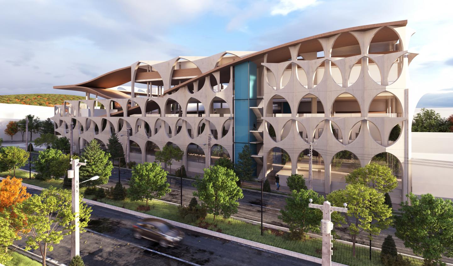 The design of the facade shell, which is taken from the form of Islamic architecture arches, helped to use it as a metaphor that shows that by passing through the facade of the building, it enters a space with architecture taken from the diagrams of the concept of collective monotheism in contemporary times. This shell is reminiscent of the context from which the architecture of this complex is taken, contemporary Iranian architecture during the Islamic era. This type of shell is derived from the form of a sharp blade that is rotated 30 degrees inwards from the middle.