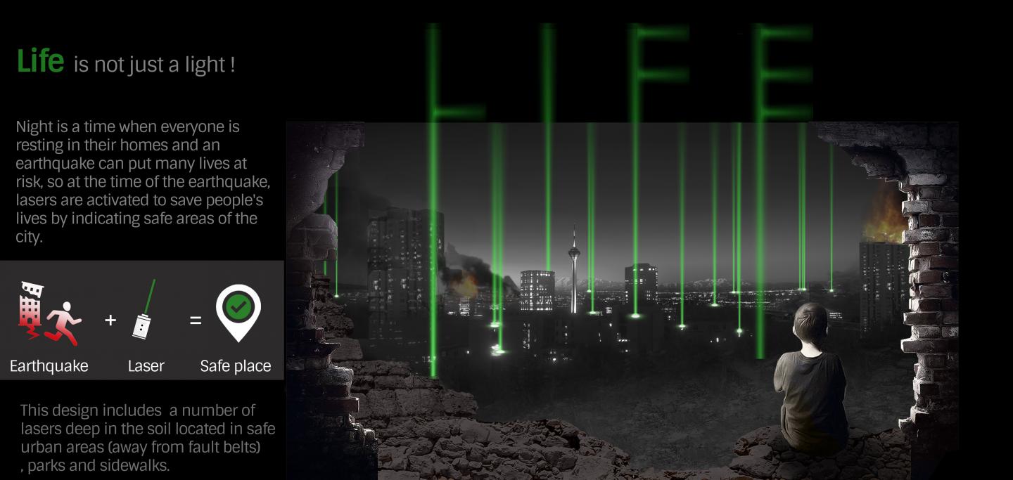 Night is a time when everyone is resting in their homes and an earthquake can put many lives at risk, so at the time of the earthquake, lasers are activated to save people's lives by indicating safe areas of the city.