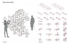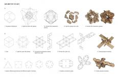 A cross-referencing method, which includes geometry study, material study, fabrication test, and structure analysis, is developed by this research collective to serve as the driving force of this project. The feedback among each approach provides guidelines for future research and practice. The geometry study shapes the form-searching process and provides theoretical support for the unit design by understanding the physical properties of different geometries and connection methods. The material study is conducted on the aspect of material dimension, grain orientation, stiffness, and elastic properties. Three key issues come from the fabrication test: milling speed of the current robot setup limits the scale of the final structure, the dimension limitation and maximum load of a robot affects the form and size of the unit, the accuracy of robotic fabrication and bending behavior of wood material during the change of air humidity require more tolerance to be considered during the unit design process. The final design is also guided by the feedback of structure analysis, which centers around structural performance. With this methodology, this project integrates the design and the materialization process to a responsive loop rather than the conventional linear process which prioritizes the design to the materialization.
