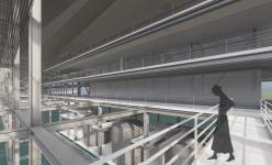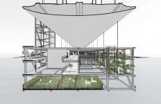 Infrastructure consists of spaces that build community strength, provide life support and technical support, and a gateway that enhances biodiversity. The north has indoor spaces, while the south has green structures to increase biodiversity and return local species. While the green structure is sometimes populated indoors as an open space, indoors the green structure is populated with the nursery space. There are 3 different circulations in the building as closed, open and catwalk. While the catwalk allows to experience the green passage, it sometimes extends to the closed areas. There are places to maintain social reconciliation with nurseries, seed drying and germination, plant and animal care workshops, presentation, exhibitions, libraries and meeting areas. It includes seed development, resistant seed research, plant care and animal care units, and spaces that will provide vital support for both the habitat and the biodiversity gateway. There are sea water distillation system and water tanks, technical maintenance, control points and technical units and technical support areas that provide access to the habitat with tube circulation. The technical floor is accessed by a different staircase and elevator. Access between technical floors is through a closed tube, which provides access to the habitat for habitat needs and maintenance. There are also distillation tanks and water pipes to meet the needs of the habitat and biodiversity gateway.