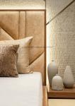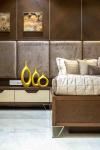 The son’s bedroom is dramatic with its backdrop pattern of mcm cladding and mirror Patti, which further reflects in the tufted pattern of the headboard. The minimalist study table is designed in the cozy corner.