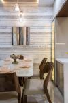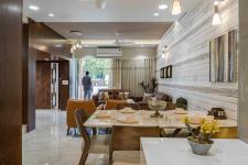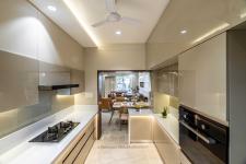 The Corian finish top for the platform and PU finish for the furniture keep the kitchen bright and natural. The Dining top is gorgeous artificial white marble that makes the space even more spacious and light.