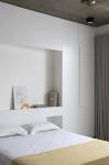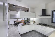 A bare minimalist approach to design has been adopted to great effect throughout. The main entrance is from an external verandah via an entry niche into the living room, which then faces a mini landscaped ‘court’ in front. The adjoining dining room opens out to a similar feature in the rear allowing for cross ventilation. This rear court is capped by an open skylight treatment, allowing sunlight to drape the internal walls and to visually denote a vertical link. Horizontally also, this space wraps around to the open kitchen plan to form one harmoniously flowing, continuous space.