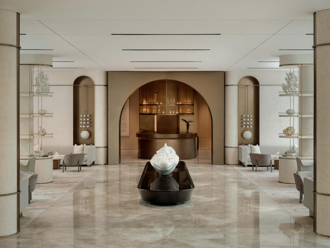 The interior of the space makes use of the existing conditions of architecture and landscape to maximize the sensory interaction between man and nature along the circulation route. Light-colored stones pave the floor with a warm and soft luster like sand and stone. The foyer is constructed with simple geometric blocks, which embarks on a tour to the region of rivers and lakes. Handicrafts with subtle touch appear different outlines when people's emotions are awakened. The rhythm of the dancing ripples is displayed by tides and waves on the curtain with melodic music and flowing images, forming a contradictory unity between dynamic and static.