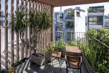 The façade consists of zig-zagging walls finished in sand-washed paint which effectively reflect the sound, reduce the noise from the busy street, and are also visually related to the ridges of a tree bark. Diverse landscape spaces are selectively placed throughout the façade in forms of planters and balconies in different shapes and sizes. The two top levels are attached with leafy gardens and a vine-covered pergola which minimizes the harsh direct sunlight. From there, a spiral stair leads to a secret rooftop garden with panorama view to the city skyline. All these unique design elements have created a vibrant connection between architecture and the nature.