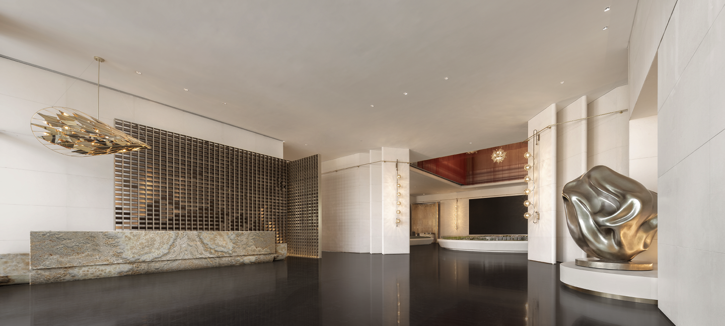 The project is the experience center of a residential development in Urumchi, Xinjiang, the largest province in China. It is a modern interpretation of ideal urban lifestyle in west China, enjoying beautiful natural sceneries including open, undulating mountains and winding rivers and embracing a unique cultural context. The design draws on local distinctive natural and cultural elements, and the flowing light and shadows reflect the fusion of modern Oriental spirit and traditional ethnic civilization. The openness and wide scale of the reception hall respond to local large-area setting. Metal grille-style screen collides with natural beige-hued stone materials, hence establishing a connection between artificiality and nature, modernity and tradition. The sunset-hued lighting fixture suspended above the reception counter echoes the sun hanging low for long in the sky at dusk in west China. The artistic sculpture placed on the opposite side draws inspiration from pleated silk satins blown by strong winds, showcasing the art quintessence of the Silk Road thousands of years ago. Ancient and natural elements are translated into an inclusive scene that inherits local history and culture.The model area is enclosed by the red metal curtain above, as if long rivers and valley are covered by afterglow, showing the magnificence and beauty unique to the city. The translucent texture of the curtain produces a sense of transparency, allowing people to experience the environment and arousing their subconscious emotion and body memories. The red-themed curtain recalls the fluttering red dress and veil of a gorgeous dancer, creating a characteristic scene with a strong atmosphere. The fireworks-shaped lamps sparkle inside the curtain, adding an eternal aesthetic to the space.