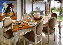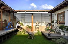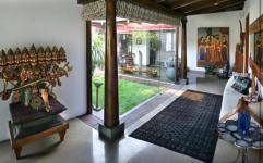 A blend of Kerala and Balinese Architecture, the house incorporates traditional aesthetic principles by using culture and artistry in every design element. It has a wooden structure, with wooden columns and sloping roofs and overhangs finished with Mangalore tiles which create a tropical look and feel. The formation of courtyards and verandah, and the use of large doubly glazed windows allows natural day light and fresh air in, thus reducing the reliability on artificial lighting, which lower down the electrical and heat load. The sustainable courts and gardens, landscaped with pebbles, hardscaped areas and native plants reduce the overall water consumption requirement. The greens courts also help control the micro climate. The use of natural materials and earthen colours blurs the boundary between the built space and its surroundings.