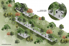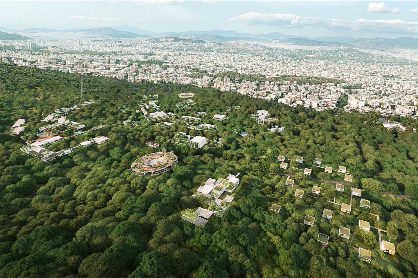 The basic building infrastructures are complemented by outdoor interventions such as ‘amines’, an open space in the form of a gazebo, or the ‘aldehydes’, a cultivation area for horticultural plants as a more regulated form of planting. The athletic facilities of Democritus are upgraded, as two new bicycle paths connect the new areas with the existing walking routes of Hymettus. The complex is connected both conceptually and practically with the city and the site's landscape, with the help of a continuous walk that crosses through the whole intervention.