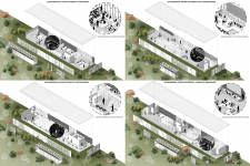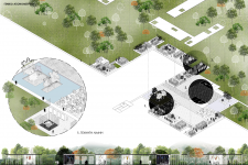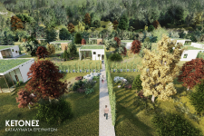 Having Hymettus’s rich vegetation and natural environment as background for the new spaces, a new form of interaction with nature is created. The invited researchers are accommodated in the 'ketones', a hotel complex in the form of bungalows, where the natural element occupies most of the room's interior. The ‘solution’ is the central dining area with numerous vertical gardens, while the speeches of distinguished scientists take place in the ‘core’, the central amphitheater with the flowered stands. The 'transmitter' translates as the open exhibition space of work and dissertations of Democritus, while students and teachers gather in the 'collectors' for experimentation and transmission of knowledge, as they are the central laboratories of the complex. The 'nucleon' hosts all the seasonal activities of the research center but can also be used as a relaxation area for visitors due to its gradient construction with a projection screen at its base.