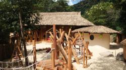 The building is built with the main structure of a traditional wooden truss frame, coconut leaf roof, rough plastered walls, wooden main floor, porch and toilet area finished with granito. In front of the building are movement games made entirely of natural wood. Behind is the natural splash parks, combined with the zip lining, a climbing area simulating the forest.