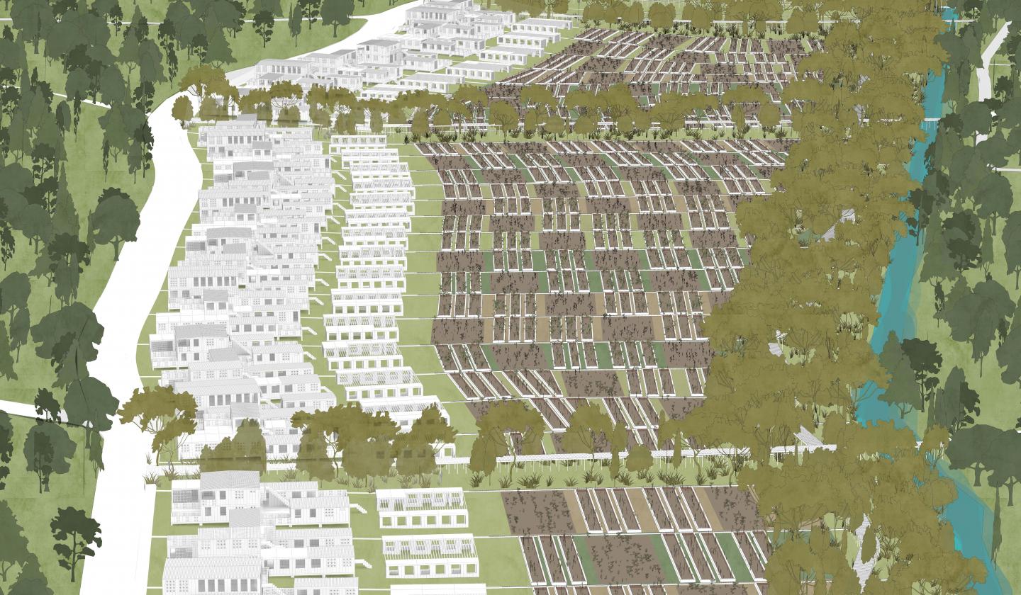 The landscape was reimagined into 3 zones: the urban zone, the agricultural zone, the ecological zone. The Urban zone consists of the modular housing system, the agricultural zone consists of farming land attached to each house and the ecological zone is a fruit tree area which will be allowed to grow wild to protect the river from any agricultural runoff and serve as a barrier between the built area and wild landscape. By creating these zone the goal is to use the presence of the people to assist in the rewilding of the environment and thus reduce the pollution in the Almendares River.