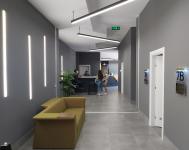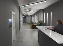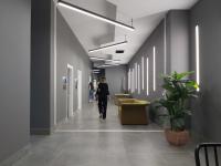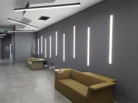 Since interacting with the daylight in the doctor’s offices is made mandatory with regulations, the waiting areas are rather devoid of sunlight. The patient will spend the majority of their time in the waiting areas therefore the waiting area space is more dynamic than the other spaces of the design. Because sunlight is blocked by the clinic rooms, to maintain a well-lit, comfortable, and contemporary atmosphere, wall-mounted lighting fixtures are used as well as a dynamic celling accompanied by linear lighting elements.