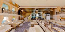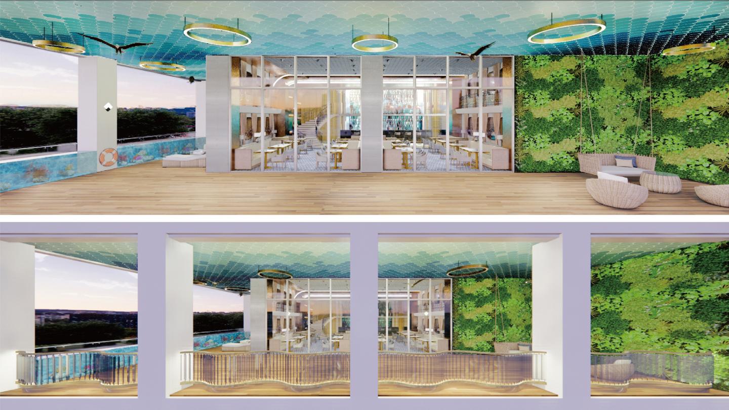 This project is a restaurant. It mainly focuses on providing a cruise boarding experience. The location is set around the port and overlook the port. This restaurant has a reception counter, an aisle and a dining hall, which respectively corresponds to customs, a boarding bridge and an atrium of a cruise. The dining hall is high enough to create a mezzanine and small side platforms alongside the side walls, which adding layering to the vertical height. It is also equipped with spiral stairs and cabin windows, depicting vividly a cruise. Moreover, the ceiling is formed like a grid which assembles the coordinate of the universe in the wild open ocean. It seems this cruise has already sailed out. As for the materials, it mainly includes sheet metals, wallpapers, mirrors, woods and marbles. These materials create a luxury and magnificent visual feast. The guests enjoy a complete and authentic cruise experience in the process of showing their tables and dining. At last, the balcony reproduces decks of a cruise. Meanwhile, it is also equipped with aquarium simulating the ocean. The ceiling on the balcony is curve-shaped and blue-painted, which emits light through gaps. When standing on the balcony, the ceiling forms either like waves or clouds depending on whether you decide to set sail or pull in to shore. If you decide to pull in to shore and look at the port or the city, it seems the cruise has arrived at its destination, driving you to visit the port or the city after their meals.