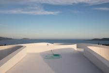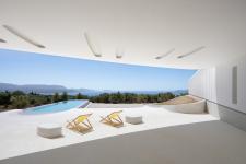 The height of the project is constrained to the peak of the surrounding trees, whilst maintaining panoramic views to the sea from a roof terrace. The wall elevation varies as it is gradually sunken into the terrain, tapering the height of the facade to 1.2m at the end of each wing. The excavated earth was recuperated to create a tapered transition enabling a softer integration of the project within the agrarian landscape. The west wing contains the public areas as well as a large opening towards the sea and the south terrace. Internally, each room is extended by a terrace and courtyard. The room wall projects outward and folds to frame a lemon tree. The absence of corners and the continuity of the wall provide spatial expansion. The curved walls frame the changing sky colour and light, inducing a strong presence of the sky within the interior.