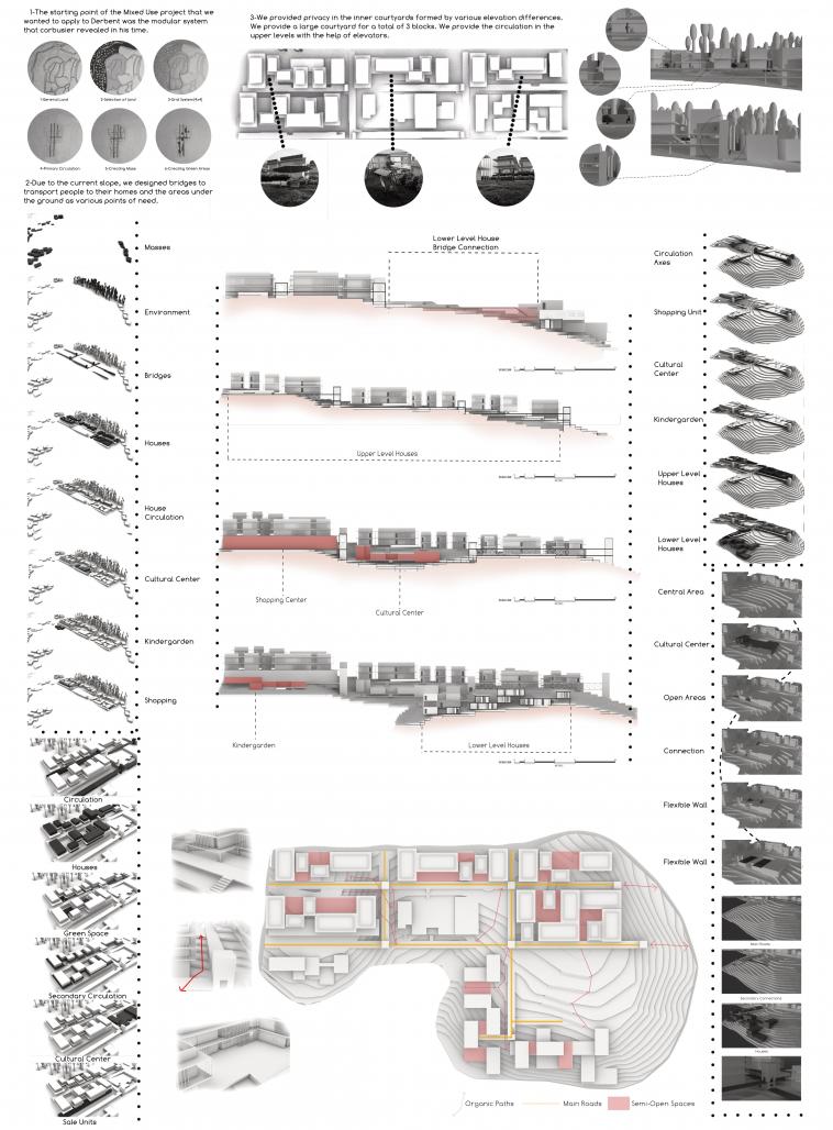 The project area is located in Sarıyer/Derbent district. The slope of the land selected for the mixed use project in the region is approximately 30 meters. In this project, a session was designed according to circulation. Except for the residences, no intervention was made for any transportation line to the land. The steel carriers and the radical circulation lines coming from the land are designed to meet the needs at every point of the project. While this is the most suitable solution for the slope, sudden elevation differences are provided by 6 central elevators and cores. Housing settlements were created with a grid system. The mass settlement also defines us the social areas and the points where other functions will exist. Structures with a single storey at places where the slope range becomes very dense and two storeys at other points provide morphological courtyard formation. The design of the houses has occurred with 7,40x7,40 Modules. It has gained diversity thanks to the addition and removal of various modules. While the main circulation line is bridges, the 2nd circulation line is provided by the cantilever movements made on the 1st floor of the masses. Neighborhood relations are very important in Derbent region. While providing access to houses and other functions thanks to radical bridges is at the forefront, construction of stairs integrated with the land and passages under or right-left of these bridges are left to the discretion of the user. In addition to a cultural center located in the center and a kindergarten associated with the exterior, other functions have been solved in the underground levels.