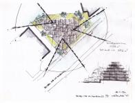 If the building were to be aligned with the street, developing 3 housing units on the standard floor would mean that the dwellings would face parallel facades, too close and unattractive. For this reason, it was decided to rotate the building 45 degrees to minimize visibility and control sun exposure. In addition, the great existing slope would have largely enclosed the first residential level so we agreed with the City Council to elevate the arcaded ground floor, raising the first floor and opening up the common area, which endowed it with a monumental character.