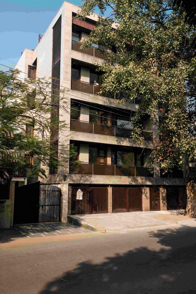 Having earlier worked with the client, there was little debate as to the nature of the finishes that would be used in the building. The plan, however, needed to satisfy the concerns of four families of varying size and at very different stages of life. Not only was there a requirement for different layouts, all of them needed to work within the structural framework of the parking on the lowest floor, besides the need for a column free basement area. Four large columns support the front of the building, simultaneously allowing for the complex variation of requirements. By pushing the service core (comprising the staircase, lift, kitchen and staff room) to the rear of the building, the full front width could be used for the principal spaces. This width was then divided into 3 parts – the central space became the living room, connected to the exteriors at both ends, allowing for the house to be naturally ventilated, a rarity in such a constricted urban site. Either side was given over to the main bedrooms, with a third bedroom overlooking the rear courtyard. The resultant building is almost a perfect cube, measuring 45’x45’x45’, hovering above the pilotis of the parking level.