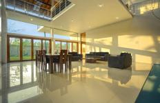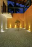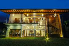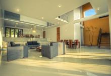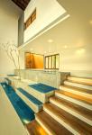 The central living area with high roof, cascading water body and unhindered views of intriguing landscaping through huge window panes provides a dynamic and spacious place for family interaction.