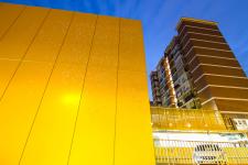 It is used to perform an industrial-based fluorescent lighting to illuminate the entrance porch at night while enhance the facade presence in the neighborhood when light goes out trough perforations on the new steel sheet, as a negative diurnal effect.